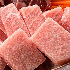 天然目鉢まぐろの“ハラモ”と“カマ肉”を一口台にカットし鍋の具材としております。